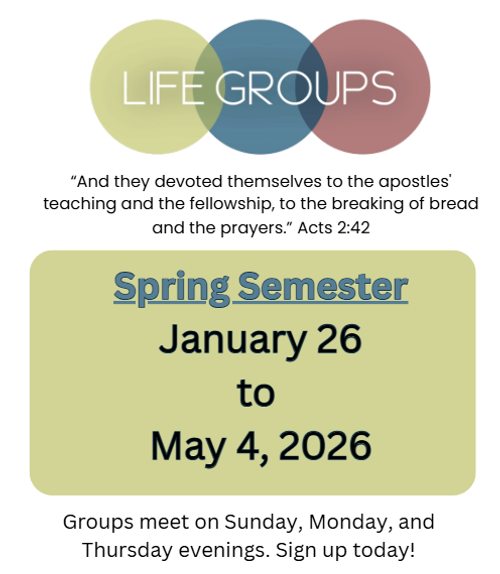 This spring, we will be starting Life Groups back up! We will be meeting weekly, discussing the sermon, fellowshipping, and praying together! By studying God's Word, praying, and growing in relationship with one another, we believe Life Groups are one of the main means God has given us for discipleship!